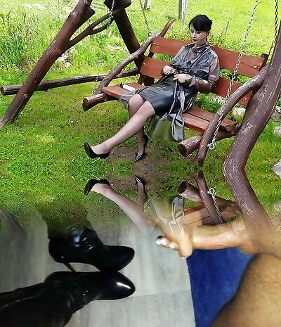 Black-haired Mature Showing Off Hder Pantyhosed Legs and Feet
